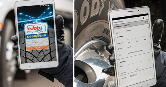Aplikacja Goodyear eJob obejmuje wszystkie prace związane z oponami do pojazdów ciężarowych. Ponadto umożliwia przekazywanie i otrzymywanie wszelkich niezbędnych informacji, w tym o pozycji opony na osiach pojazdu. Przy pomocy tabletu dane można wysyłać oraz odbierać już w trakcie serwisowania opony. Jeżeli konieczna jest wymiana, można wykonywać zdjęcia ogumienia i dołączać komentarze. Dzięki temu operator pojazdu ciężarowego może wirtualnie zobaczyć oponę i stwierdzić czy konieczna jest wymiana.