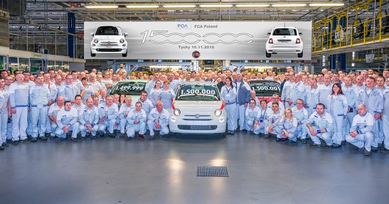 10 listopada z linii produkcyjnej tyskiej fabryki FCA Poland, zjechał egzemplarz modelu 500 o numerze 1 500 000. Jubileuszowa „Pięćsetka" to Fiat 500 w wersji Pop w kolorze białym (bianco gelato), z silnikiem 1,2 l o mocy 69 KM trafi do Klienta we Francji. Samochód o numerze 1 499 999 pojedzie do Anglii, jest to wersja Pop Star w kolorze miętowym (verde lattementa) z silnikiem 1,2 l Stop&Start o mocy 69 KM. Natomiast samochodem o numerze 1 500 001 jest kabriolet 500C w wersji Lounge Cabrio w kolorze czerwonym (rosso corsa) z silnikiem 1,2 l o mocy 69 KM, który przeznaczony jest na rynek niemiecki.