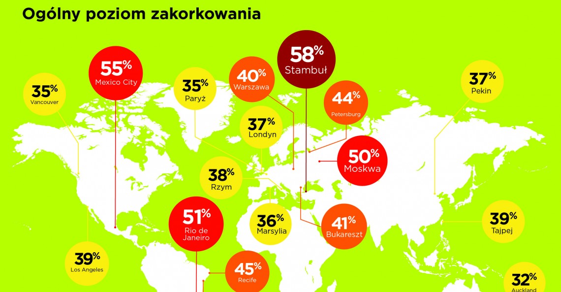 Według danych TomTom Traffic, w tej właśnie porze dnia w niemal wszystkich mocno zatłoczonych miastach można oczekiwać dwukrotnego wydłużenia czas podróży. Najbardziej zatłoczoną aglomeracją w globalnym rankingu jest turecki Stambuł, gdzie średni poziom zatłoczenia wynosi 58%. O tyle dłużej trwa podróż w porównaniu z jazdą w warunkach swobodnego przepływu ruchu drogowego.